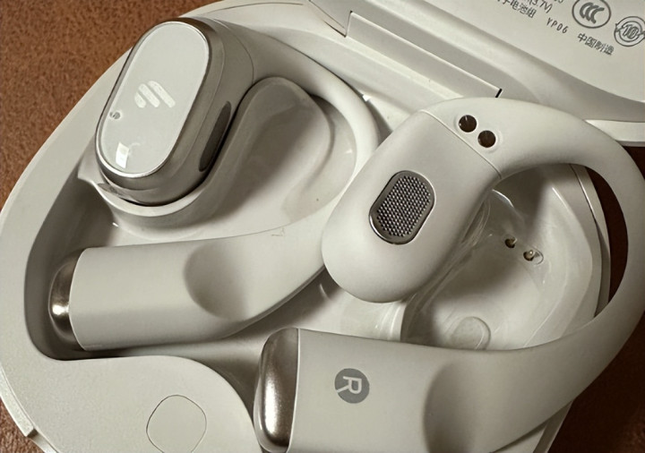 同样是开放式不入耳的设计搭配食品级的液态硅胶耳挂,耳挂的触感细腻。重量是10.2克,压感比较重,但是又通过重量配比进行优化,久戴的压迫感也不强。音质上采用定制级的宽频强磁复合单元,配合双引擎空间音频和头部追踪技术,声场很开阔,声音的立体感强,中高音清透又自然,低频浑厚饱满,有不错的氛围感。
